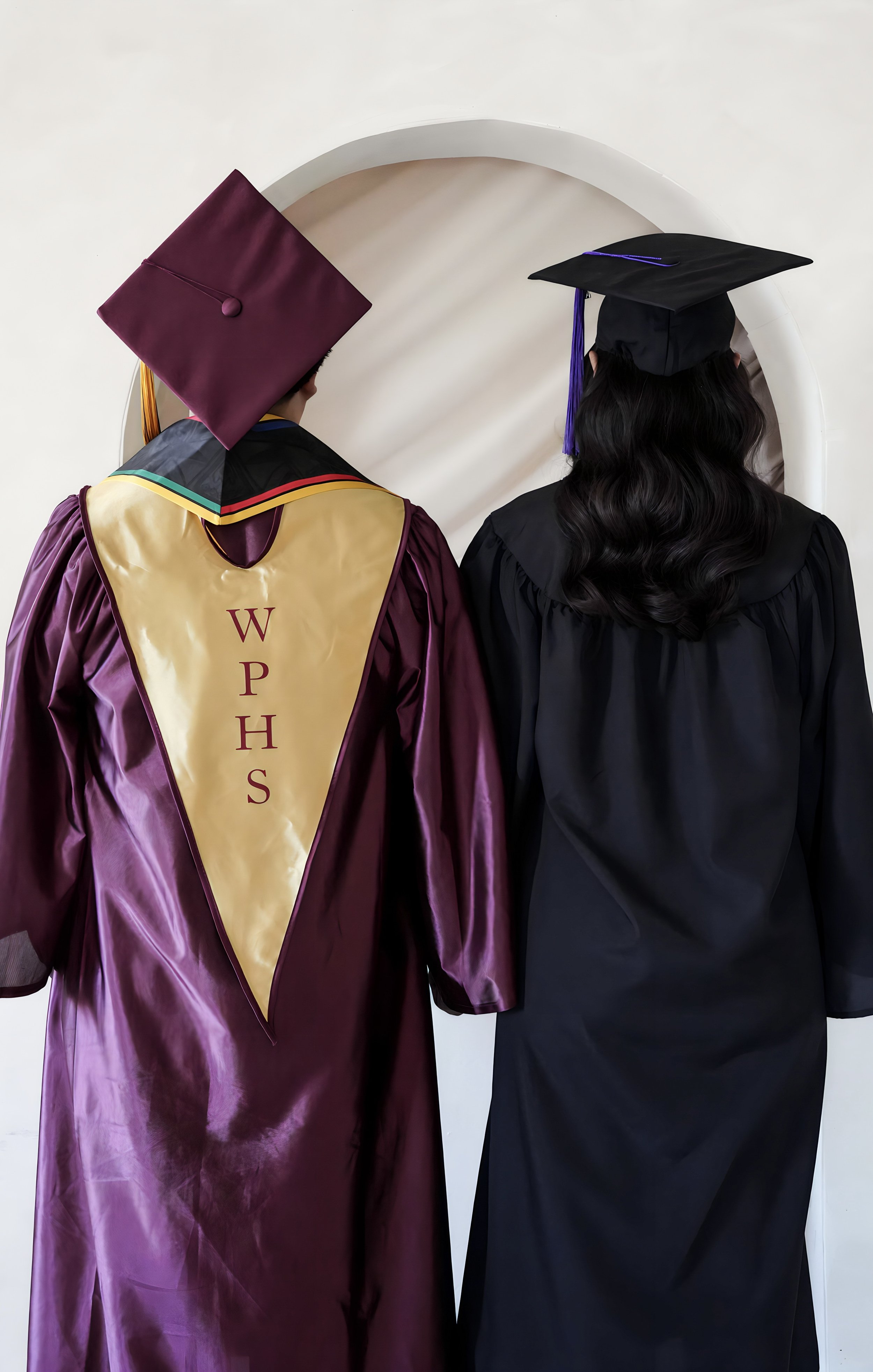 Two graduates in caps and gowns standing in front of a mirror, with one wearing a maroon gown and a sash that says 'WPHS,' and the other in a black gown with a matching cap.