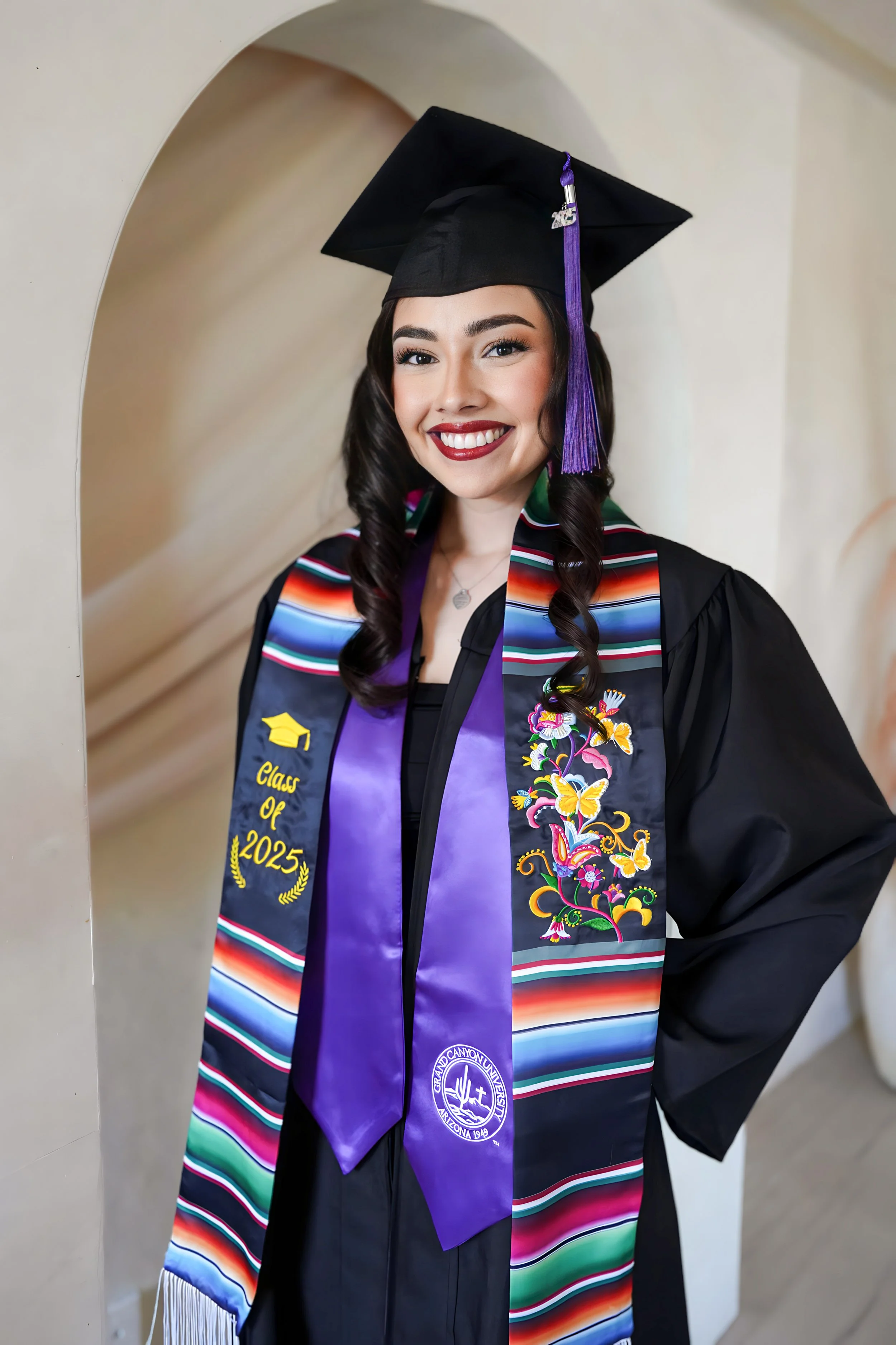 A young woman in a graduation cap and gown standing in front of an archway. She is wearing a colorful, embroidered sash and a purple tassel with '2025' on it. The gown features embroidered designs and a purple stole from Grand Canyon University, cele