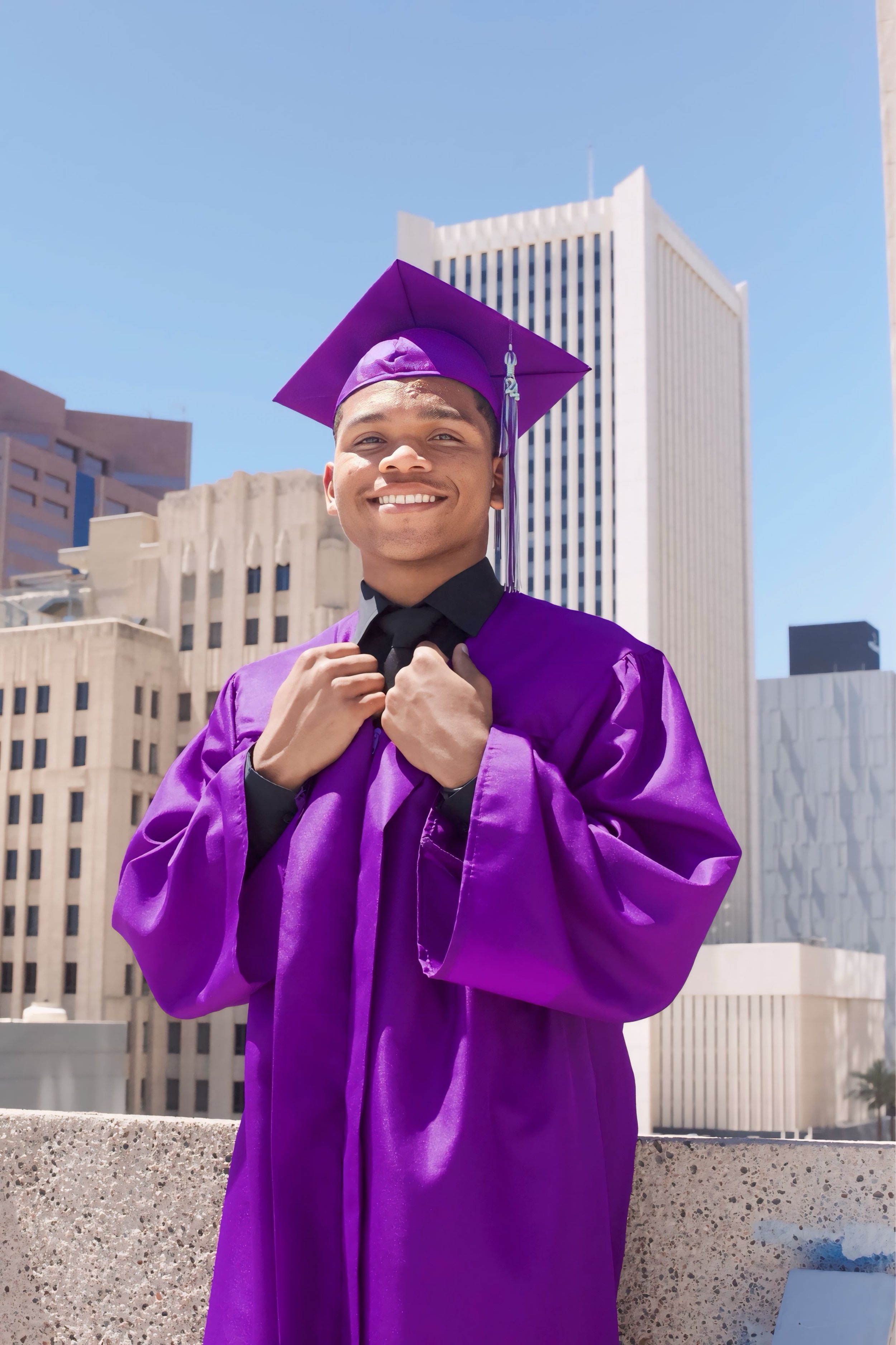Young man in a purple graduation gown and cap smiling outdoors with city buildings in the background.