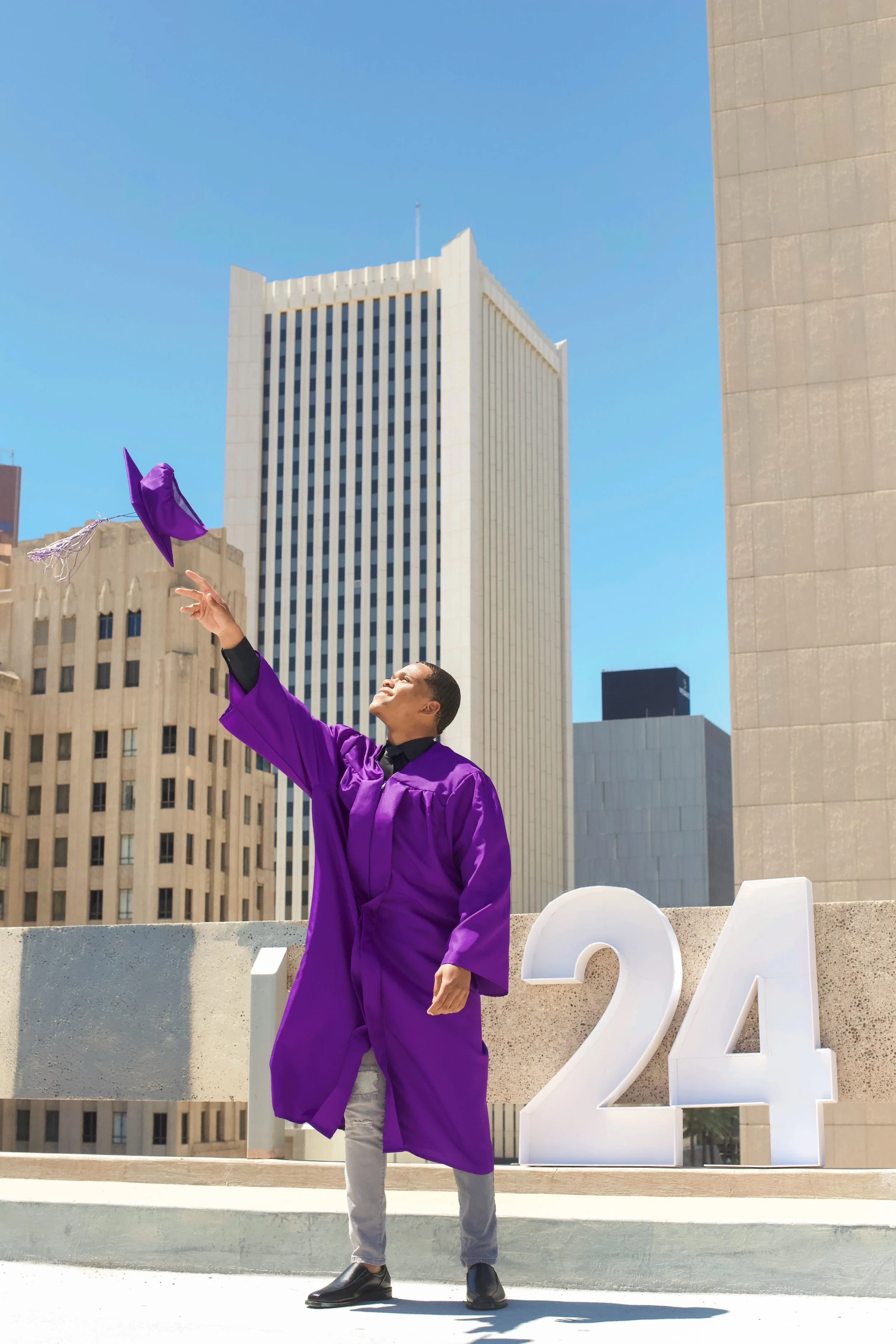 Graduating student in purple gown and gray pants tossing graduation cap on rooftop with large white number 24 and city skyscrapers in background.