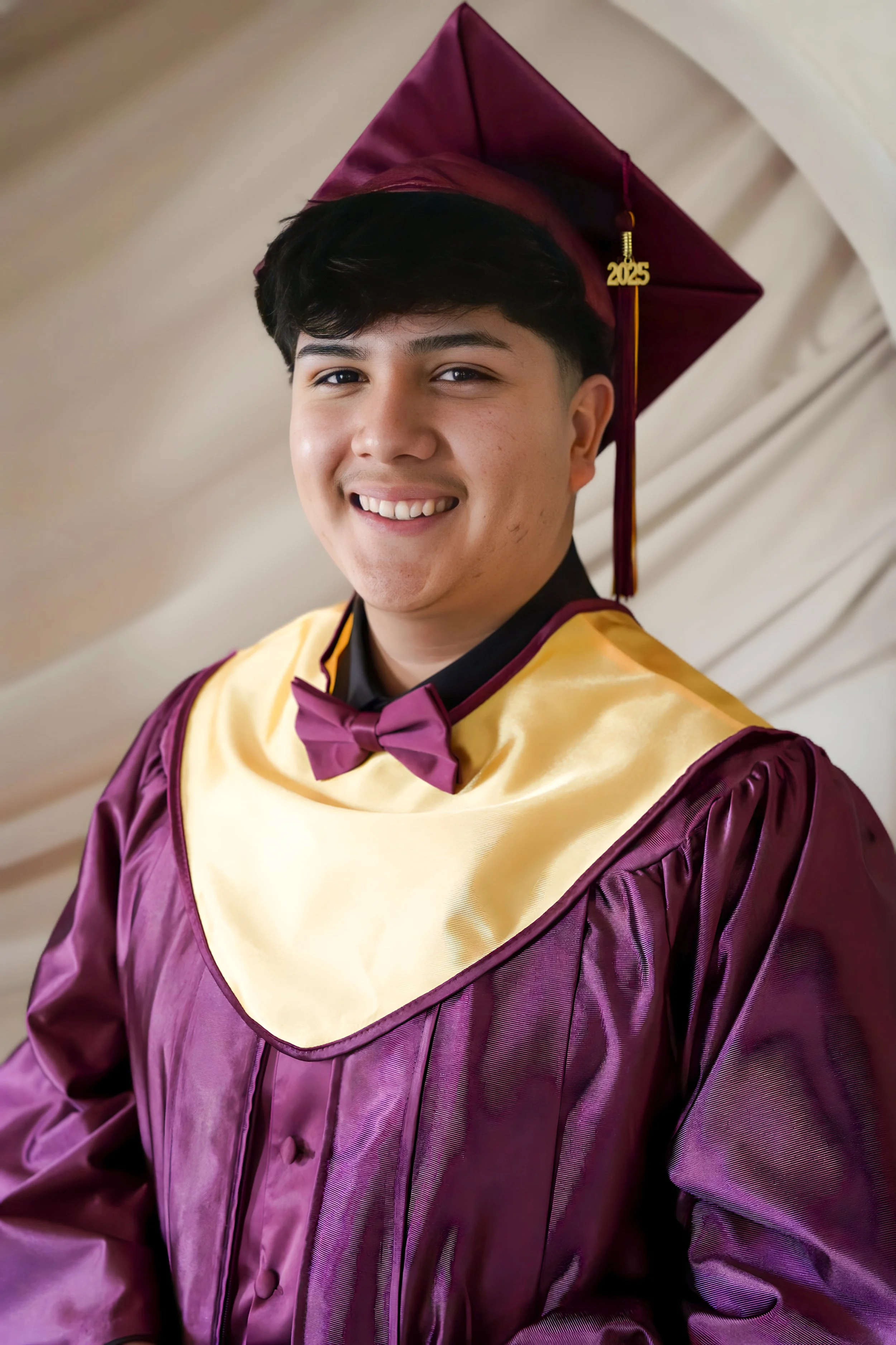 A young man smiling in graduation attire, wearing a maroon cap and gown with a yellow stole and a maroon bow tie, standing indoors with a blurred background.