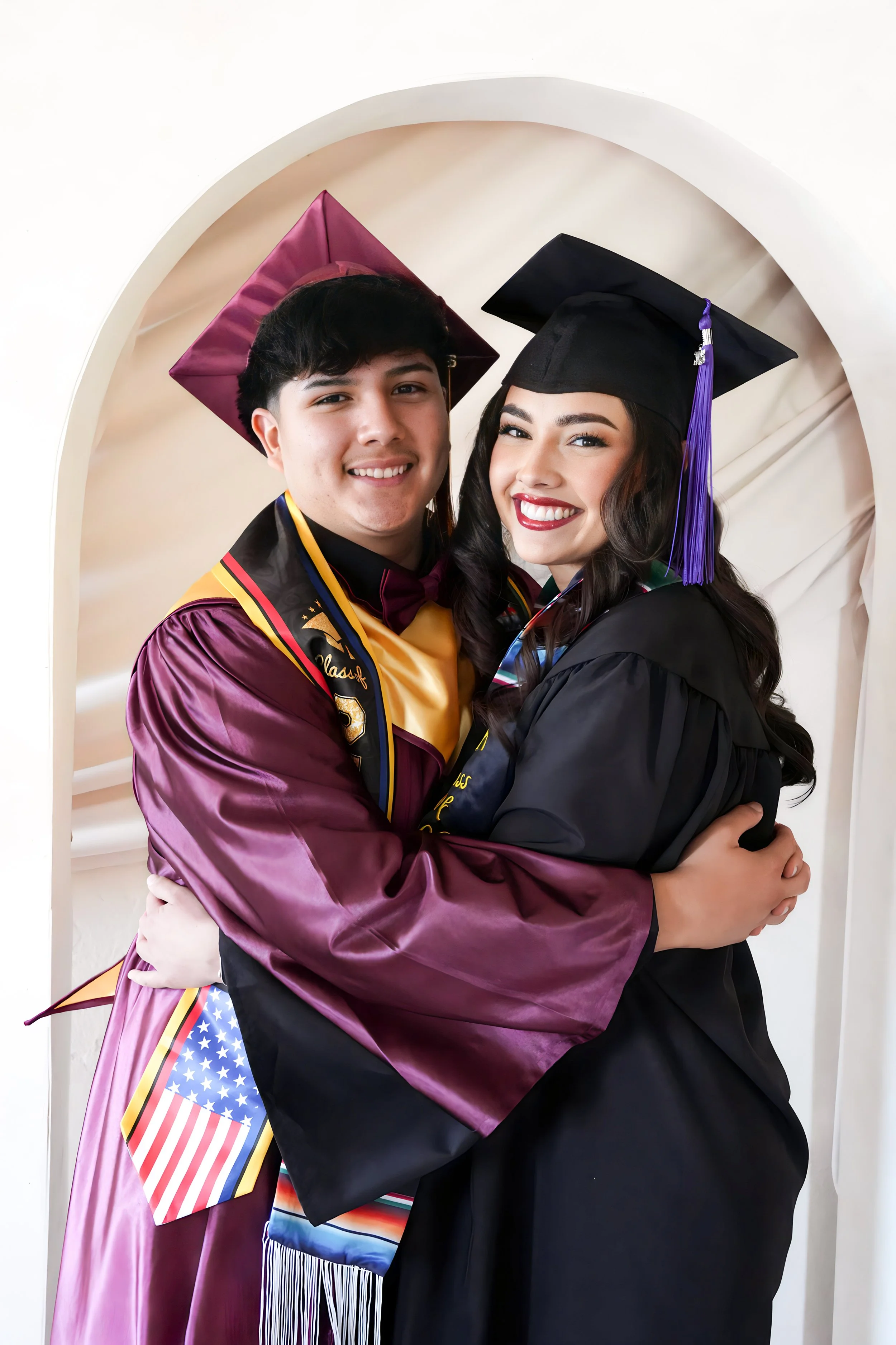 Two young graduates, a man and a woman, in caps and gowns hugging and smiling at the camera inside a white archway.