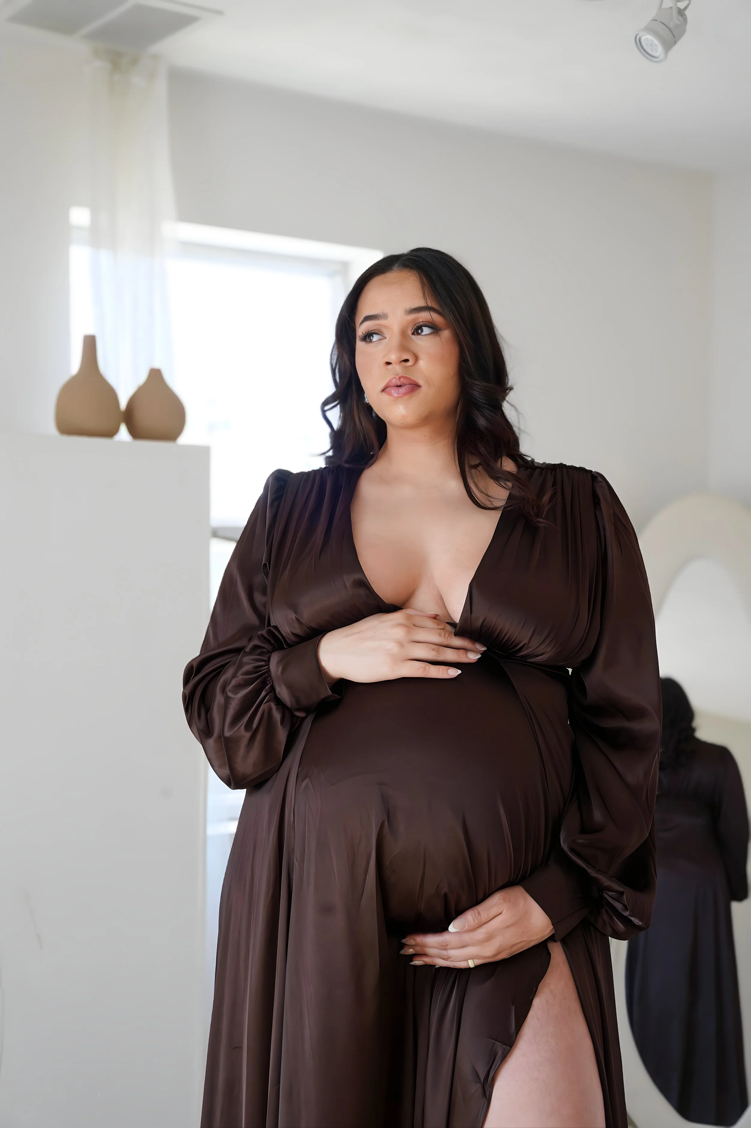 A pregnant woman in a brown satin dress standing indoors, looking to the side, with her hand resting on her belly.