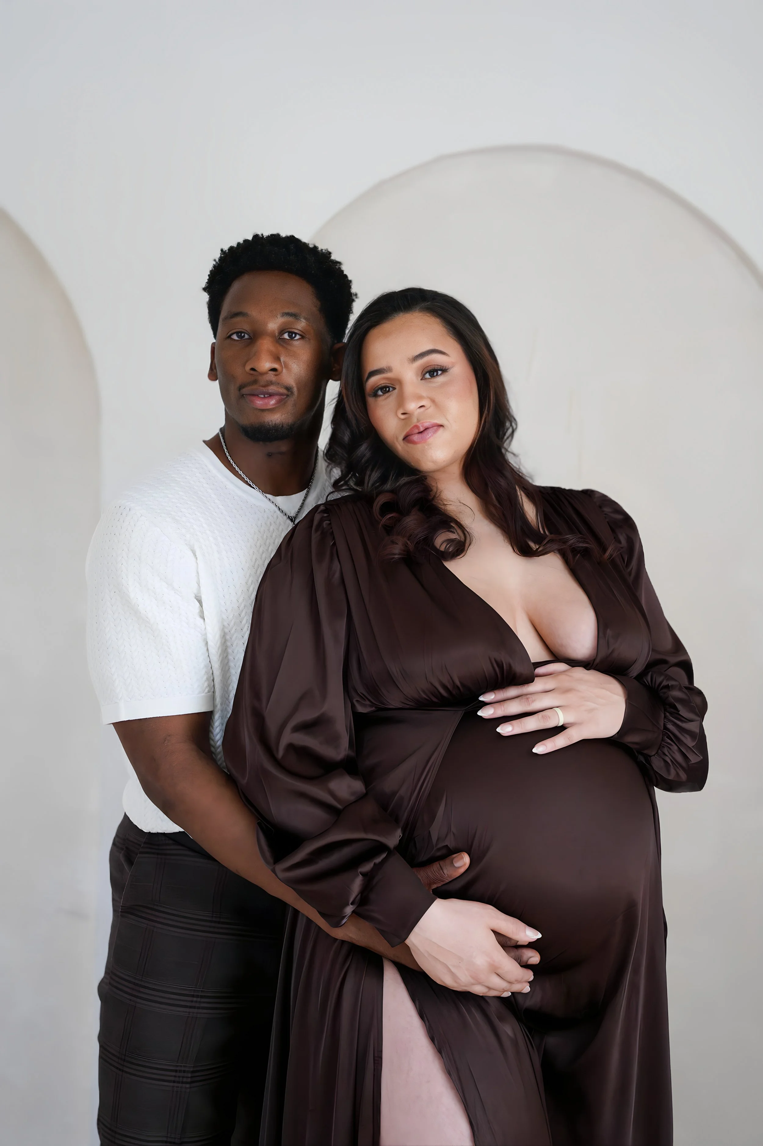A couple, with the pregnant woman in a dark brown satin dress and the man in a white shirt, standing close together and displaying affection.